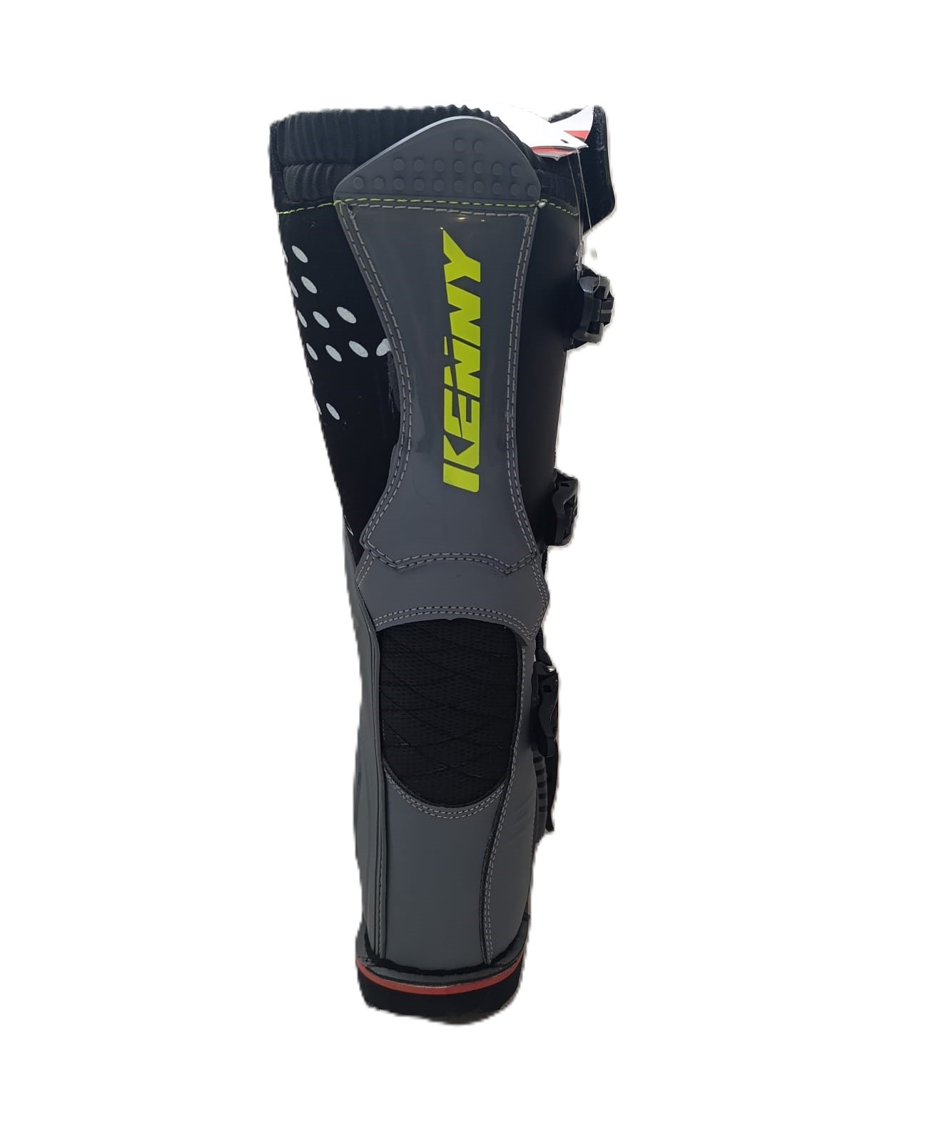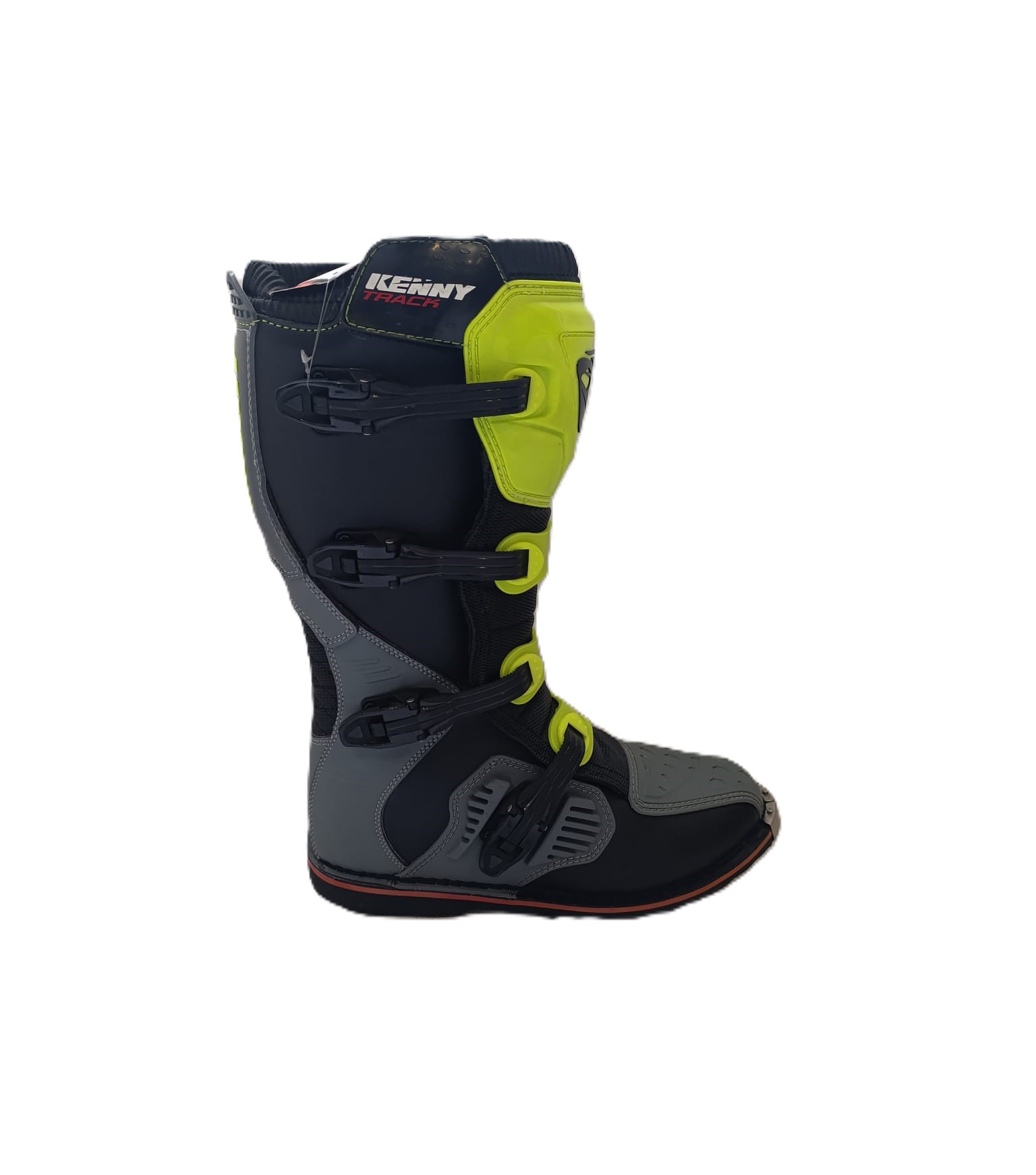 Bota de motocross preto, cinza e amarelo neon com fivelas e texto KENNY TRACK