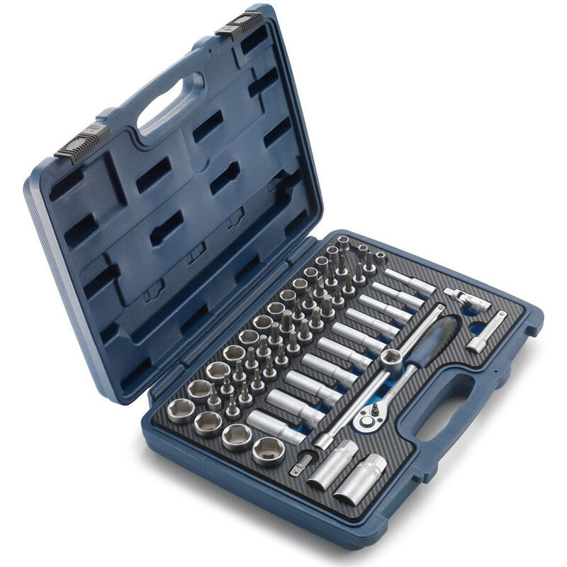 Caixa de ferramentas azul de 60 peças de 3/8" com ferramentas de qualidade cromo-vanádio.