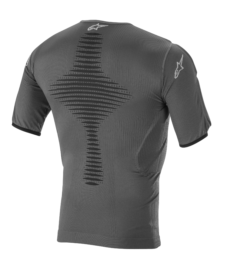 • Camiseta técnica desportiva cinzenta com padrão preto e logótipos brancos Alpinestars