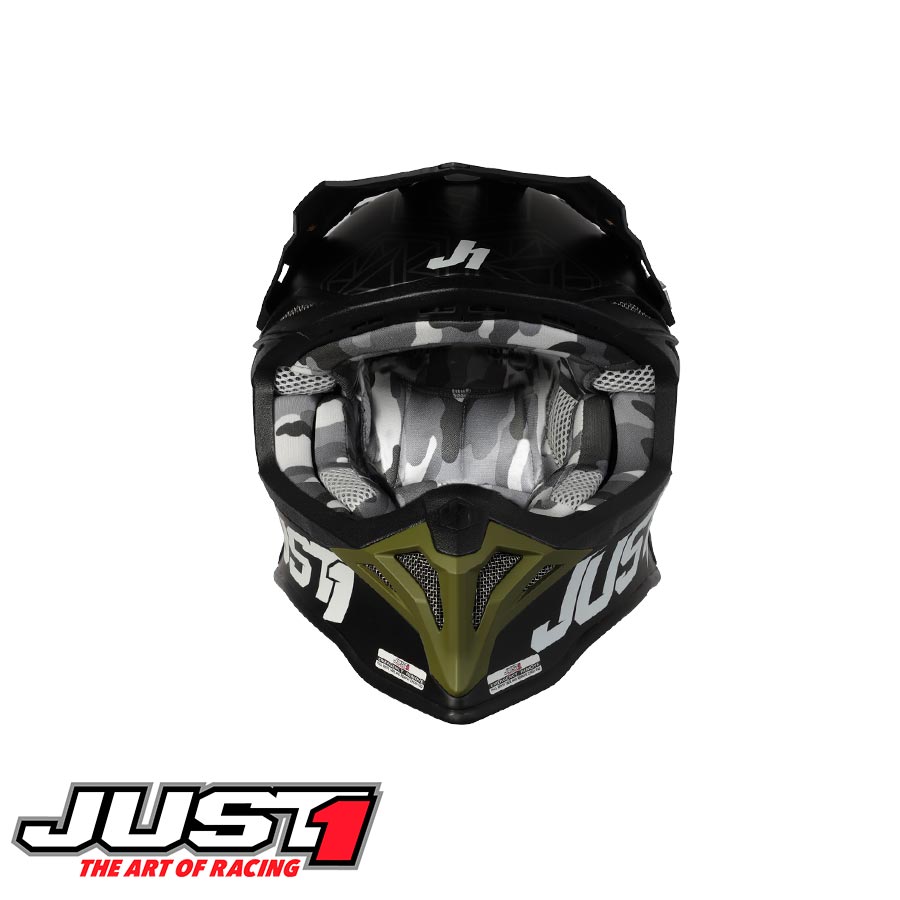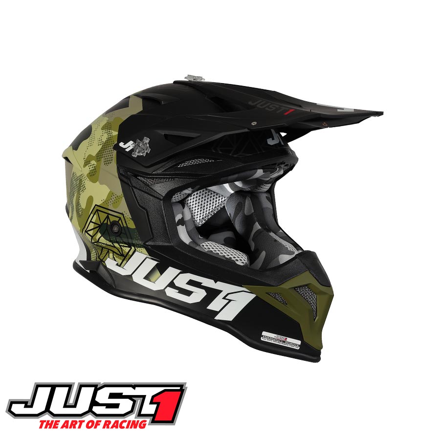 • Capacete motocross camuflado verde e preto com logótipos JUST1