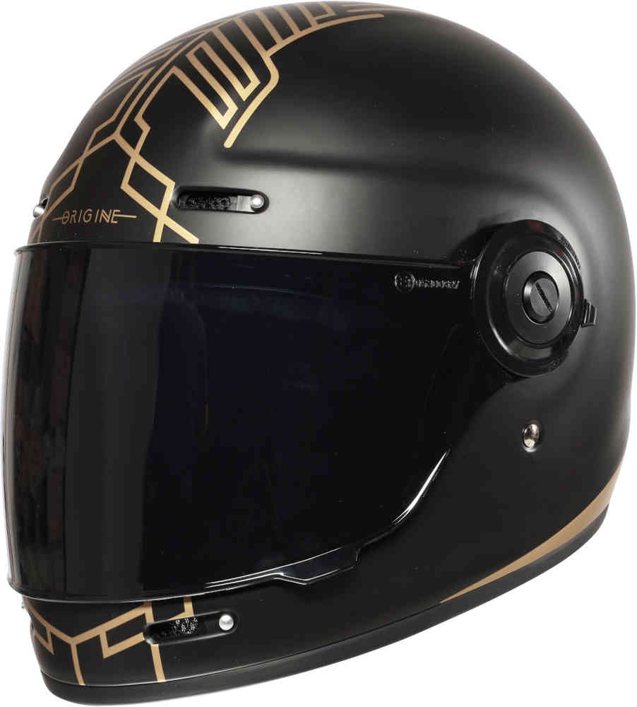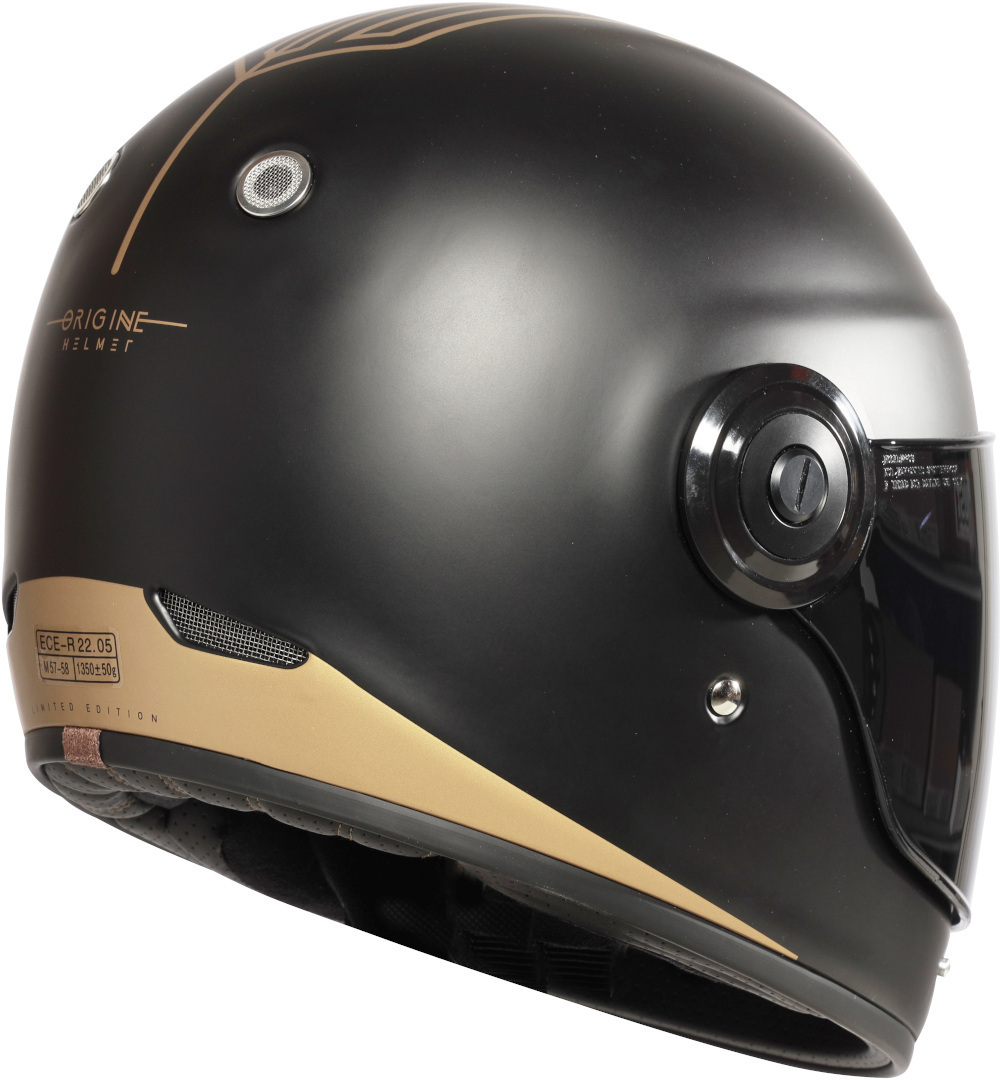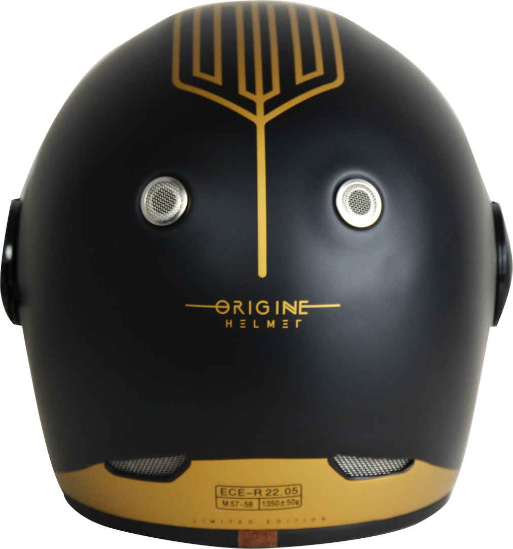 • Capacete preto fosco com detalhes dourados e texto ORIGINE HELMET