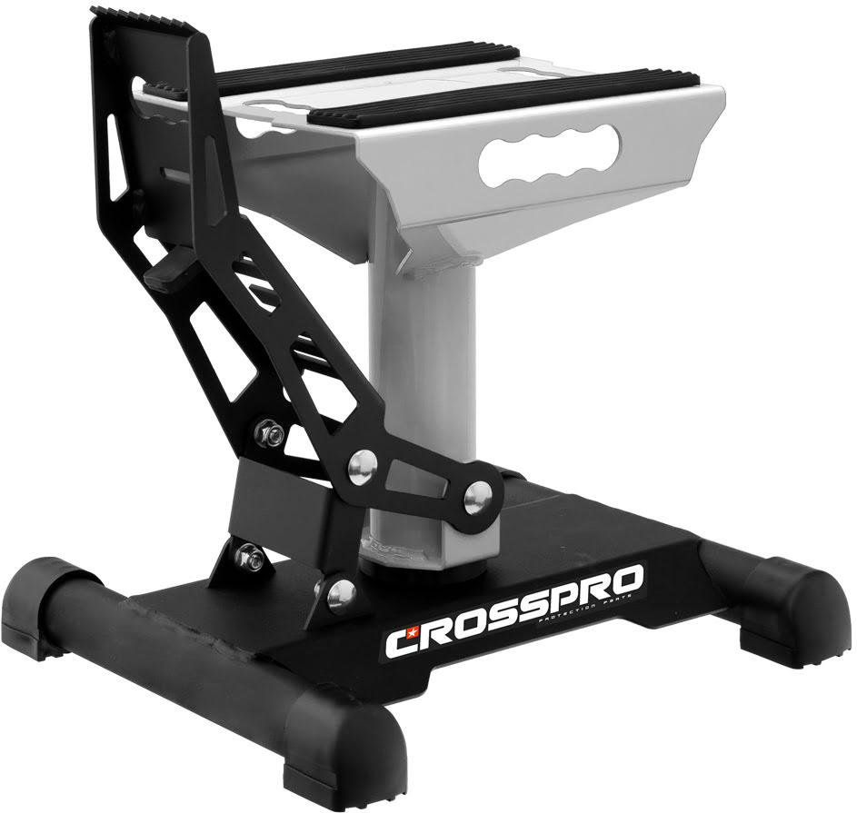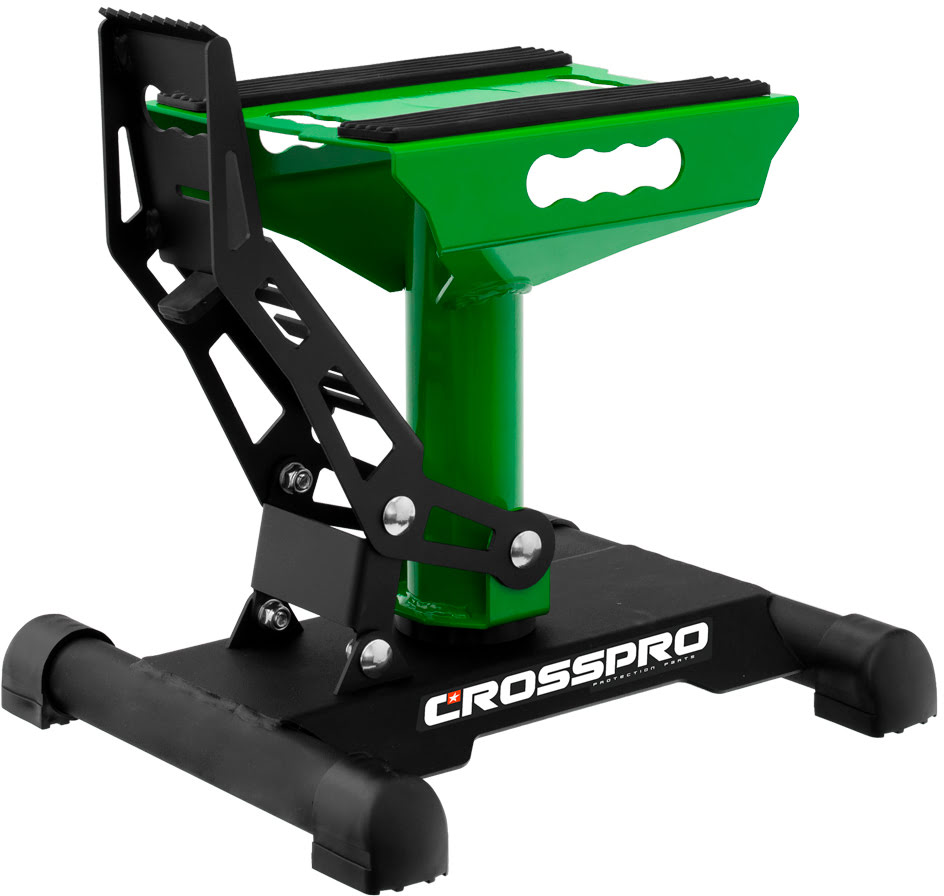 • Suporte elevatório para moto em metal preto e verde com o nome CROSSPRO na base.