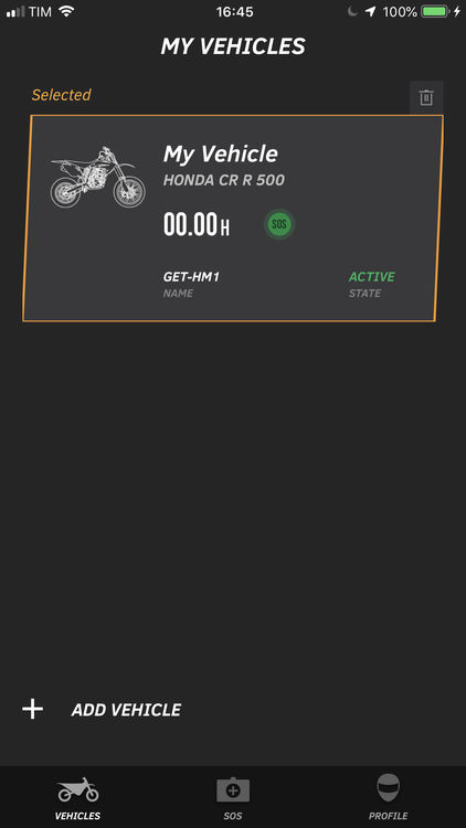 • Ecrã de aplicação móvel para gestão de veículos com uma mota Honda CR R 500 selecionada