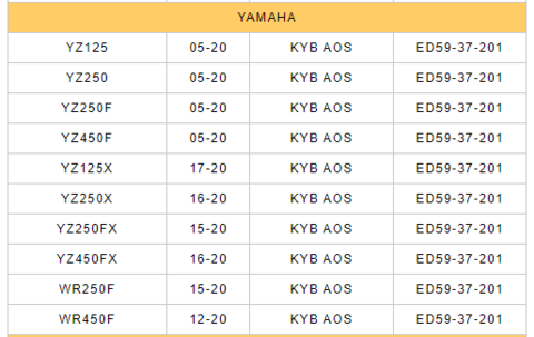 • Tabela amarela e branca com lista de modelos, anos, designações e códigos