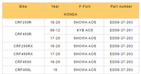 • Tabela de modelos Honda CRF com anos, forquilha e números de peças.