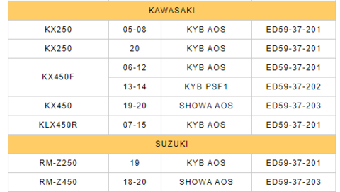 • Tabela de modelos de motos Kawasaki e Suzuki com especificações e referências.