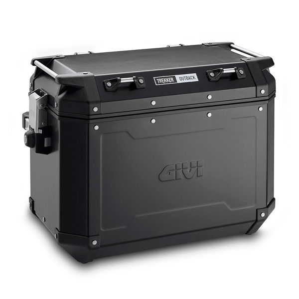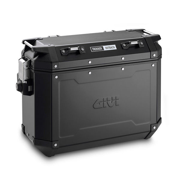 • Baú de mala lateral para motocicleta preto da marca GIVI com etiqueta TREKKER OUTBACK