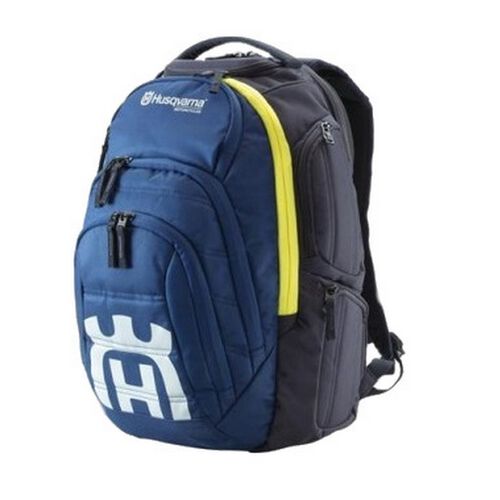 • Mochila azul e preta da Husqvarna com detalhes amarelos e vários bolsos