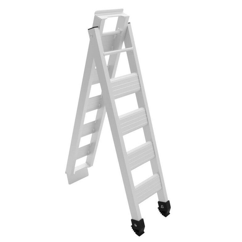 • Escada de alumínio branca com cinco degraus e pés pretos.