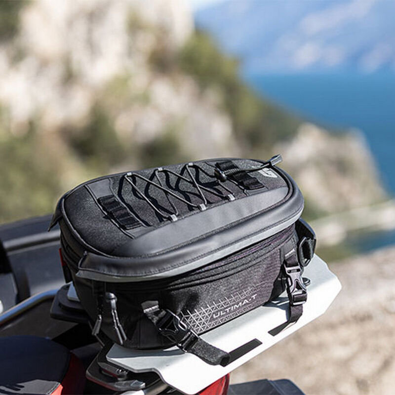 • Mala de bagageira preta para mota com elásticos na tampa superior e paisagem de montanha e mar ao fundo