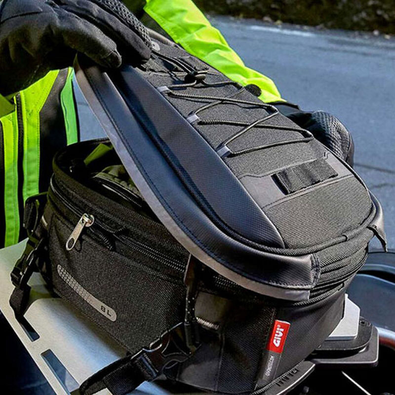 • Mala preta de mota com tampa almofadada e etiqueta GIVI
